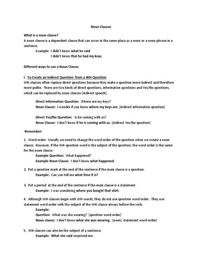 Noun clauses answers of course, each indefinite relative is part of a noun clause exercise 2 writing with noun clauses. (predicate nominative) i was frightenedby what i saw. Some clauses, however, cannot stand alone as sentences: Anyone who marvels at the thought of exploring the language will greatly benefit from understanding grammar clauses. What you are eating is a noun clause that is working as the object of the verb eat. (2) object of a verb i don't know his location. The noun clause comes after the main verb in the sentence.(hear, know) do not use question word order in a noun clause. Noun clause example as object of preposition: The cow gives us milk. Adjective, adverb, and noun.remember that a subordinate clause has a subject and a verb, but it does not express a complete thought. · whoever made this building. Give it to whoever arrives first (object of the preposition to). Independent the prime minister is in ottawa.